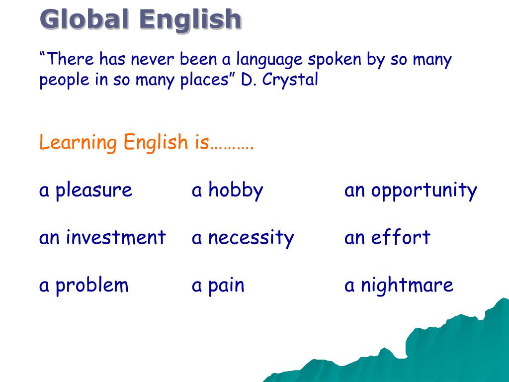 Global English “There has never been a language spoken by so many people in so many places” D. Crystal Learning English is………. a pleasure a hobby an opportunity an investment a necessity an effort a problem a pain a nightmare