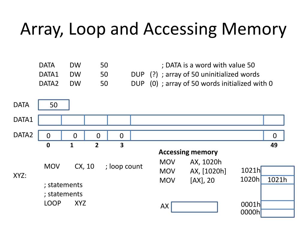 Array, Loop and Accessing Memory DATA DW 50 ; DATA is a word with value 50 DATA1 DW 50 DUP (?) ; array of 50 uninitialized words DATA2 DW 50 DUP (0) ; array of 50 words initialized with 0 DATA DATA1 DATA2 50 0 0 0 0 0 0 1 2 3 49 Accessing memory MOV AX, 1020h MOV AX, [1020h] MOV [AX], 20 MOV CX, 10 ; loop count XYZ: ; statements ; statements LOOP XYZ 1021h 1020h 1021h 0001h AX 0000h
