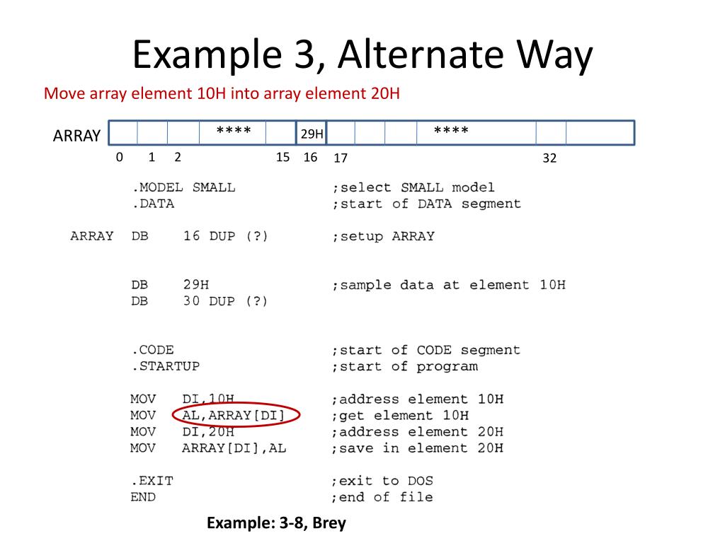 Example 3, Alternate Way Move array element 10H into array element 20H ARRAY **** **** 0 1 2 15 17 32 16 29H Example: 3-8, Brey