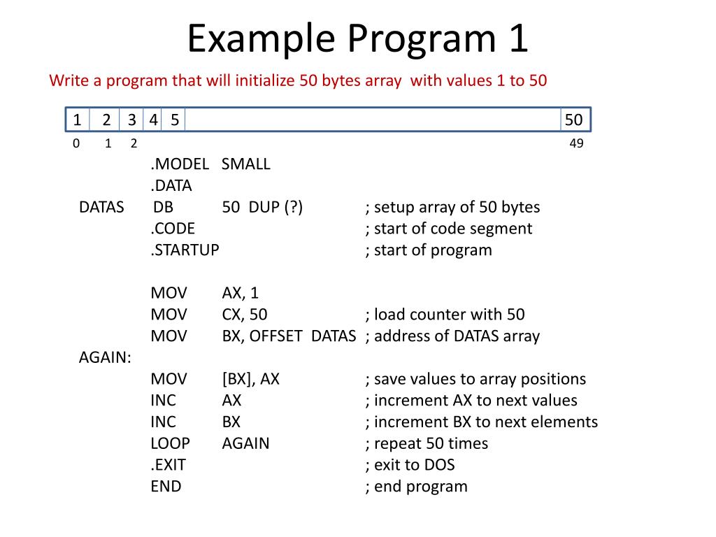 Example Program 1 Write a program that will initialize 50 bytes array with values 1 to 50 1 2 3 4 5 50 0 1 2 49 .MODEL SMALL .DATA DATAS DB 50 DUP (?) ; setup array of 50 bytes .CODE ; start of code segment .STARTUP ; start of program MOV AX, 1 MOV CX, 50 ; load counter with 50 MOV BX, OFFSET DATAS ; address of DATAS array AGAIN: MOV [BX], AX ; save values to array positions INC AX ; increment AX to next values INC BX ; increment BX to next elements LOOP AGAIN ; repeat 50 times .EXIT ; exit to DOS END ; end program