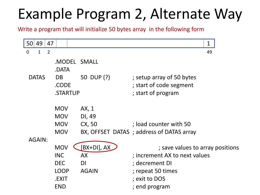 Example Program 2, Alternate Way Write a program that will initialize 50 bytes array in the following form 50 49 47 1 0 1 2 49 .MODEL SMALL .DATA DATAS DB 50 DUP (?) ; setup array of 50 bytes .CODE ; start of code segment .STARTUP ; start of program MOV AX, 1 MOV DI, 49 MOV CX, 50 ; load counter with 50 MOV BX, OFFSET DATAS ; address of DATAS array AGAIN: MOV [BX+DI], AX ; save values to array positions INC AX ; increment AX to next values DEC DI ; decrement DI LOOP AGAIN ; repeat 50 times .EXIT ; exit to DOS END ; end program