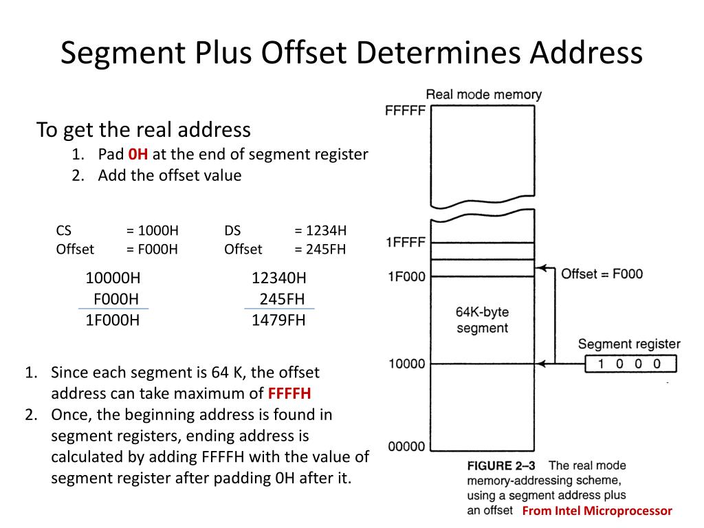 Segment Plus Offset Determines Address • To get the real address • Pad 0H at the end of segment register • Add the offset value CS = 1000H Offset = F000H DS = 1234H Offset = 245FH 10000H F000H 1F000H 12340H 245FH 1479FH Since each segment is 64 K, the offset address can take maximum of FFFFH Once, the beginning address is found in segment registers, ending address is calculated by adding FFFFH with the value of segment register after padding 0H after it. From Intel Microprocessor