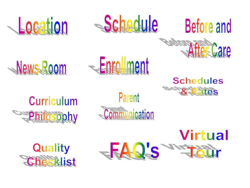 Preschool and Kindergarten. Before and After Care. Location. News Room. Enrollment. Quality Checklist. FAQ's. Schedule. Schedules & Rates. Curriculum Philosophy. Parent Communication. Virtual Tour. Mission. History. Our Gang. Additional Resources. Privacy. Legal Notice.