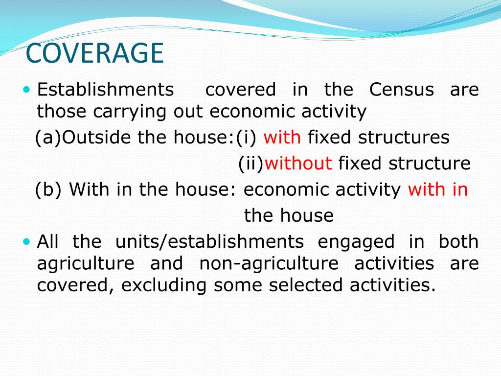 COVERAGE • Establishments covered in the Census are those carrying out economic activity (a)Outside the house:(i) with fixed structures (ii)without fixed structure (b) With in the house: economic activity with in the house • All the units/establishments engaged in both agriculture and non-agriculture activities are covered, excluding some selected activities.