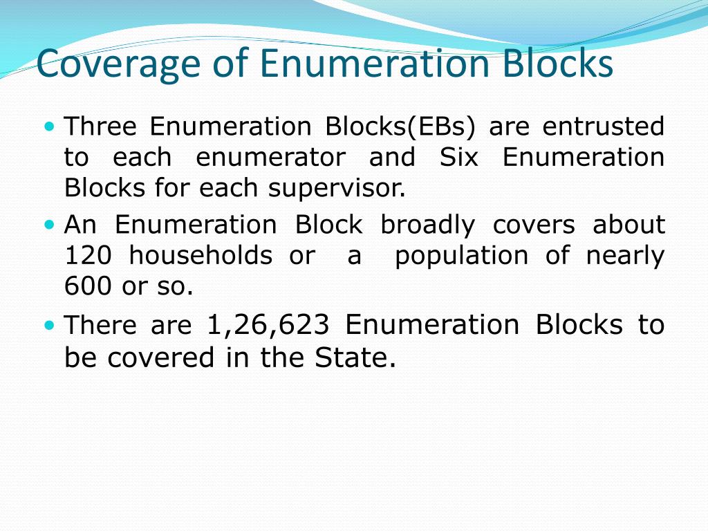 Coverage of Enumeration Blocks • Three Enumeration Blocks(EBs) are entrusted to each enumerator and Six Enumeration Blocks for each supervisor. • An Enumeration Block broadly covers about 120 households or a population of nearly 600 or so. • There are 1,26,623 Enumeration Blocks to be covered in the State.
