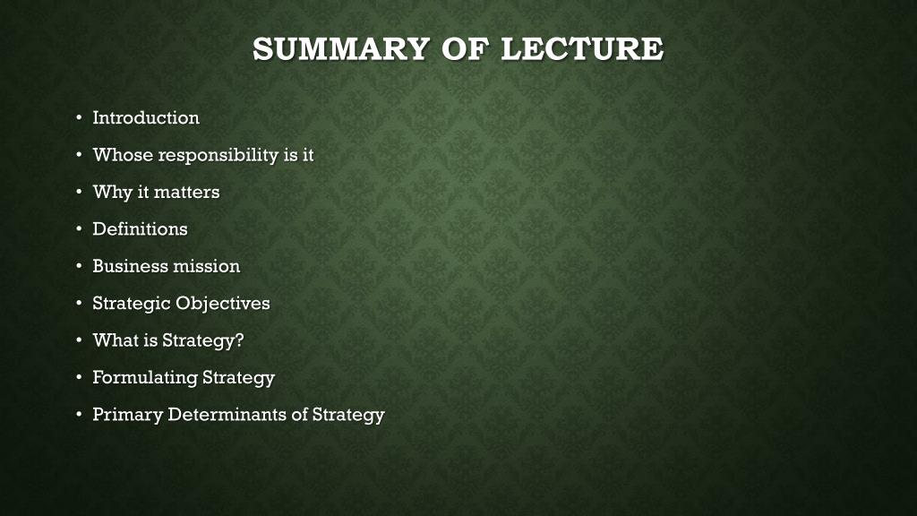Summary of lecture • Introduction • Whose responsibility is it • Why it matters • Definitions • Business mission • Strategic Objectives • What is Strategy? • Formulating Strategy • Primary Determinants of Strategy