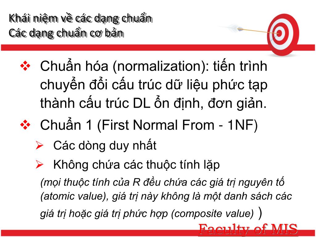 Khái niệm về các dạng chuẩnCác dạng chuẩn cơ bản • Chuẩn hóa (normalization): tiến trình chuyển đổi cấu trúc dữ liệu phức tạp thành cấu trúc DL ổn định, đơn giản. • Chuẩn 1 (First Normal From - 1NF) • Các dòng duy nhất • Không chứa các thuộc tính lặp (mọi thuộc tính của R đều chứa các giá trị nguyên tố (atomic value), giá trị này không là một danh sách các giá trị hoặc giá trị phức hợp (composite value) )