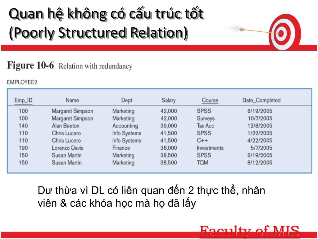 Quan hệ không có cấu trúc tốt (Poorly Structured Relation) Dư thừa vì DL có liên quan đến 2 thực thể, nhân viên & các khóa học mà họ đã lấy