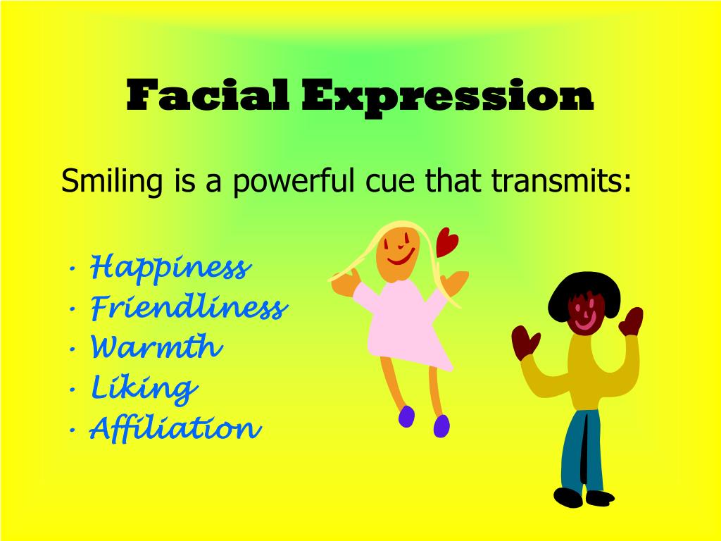 Facial Expression Smiling is a powerful cue that transmits: • Happiness • Friendliness • Warmth • Liking • Affiliation