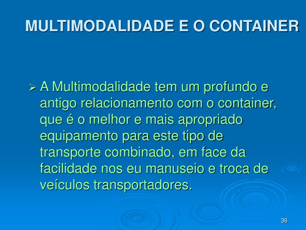MULTIMODALIDADE E O CONTAINER • A Multimodalidade tem um profundo e antigo relacionamento com o container, que é o melhor e mais apropriado equipamento para este tipo de transporte combinado, em face da facilidade nos eu manuseio e troca de veículos transportadores.