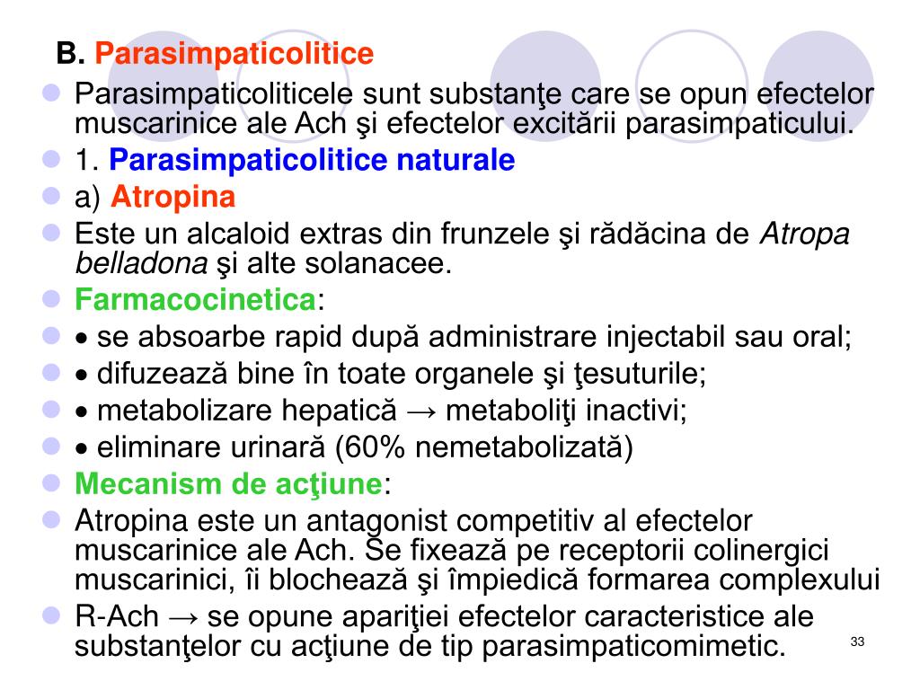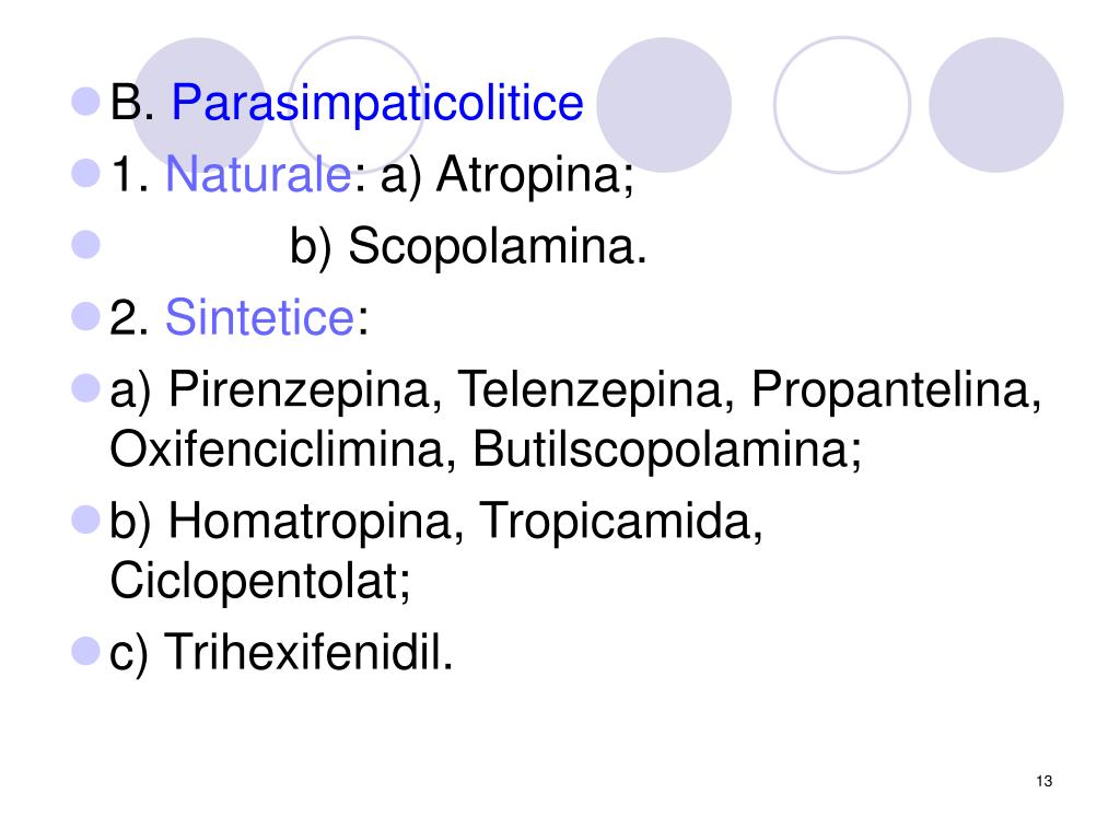 B. Parasimpaticolitice • 1. Naturale: a) Atropina; • b) Scopolamina. • 2. Sintetice: • a) Pirenzepina, Telenzepina, Propantelina, Oxifenciclimina, Butilscopolamina; • b) Homatropina, Tropicamida, Ciclopentolat; • c) Trihexifenidil.