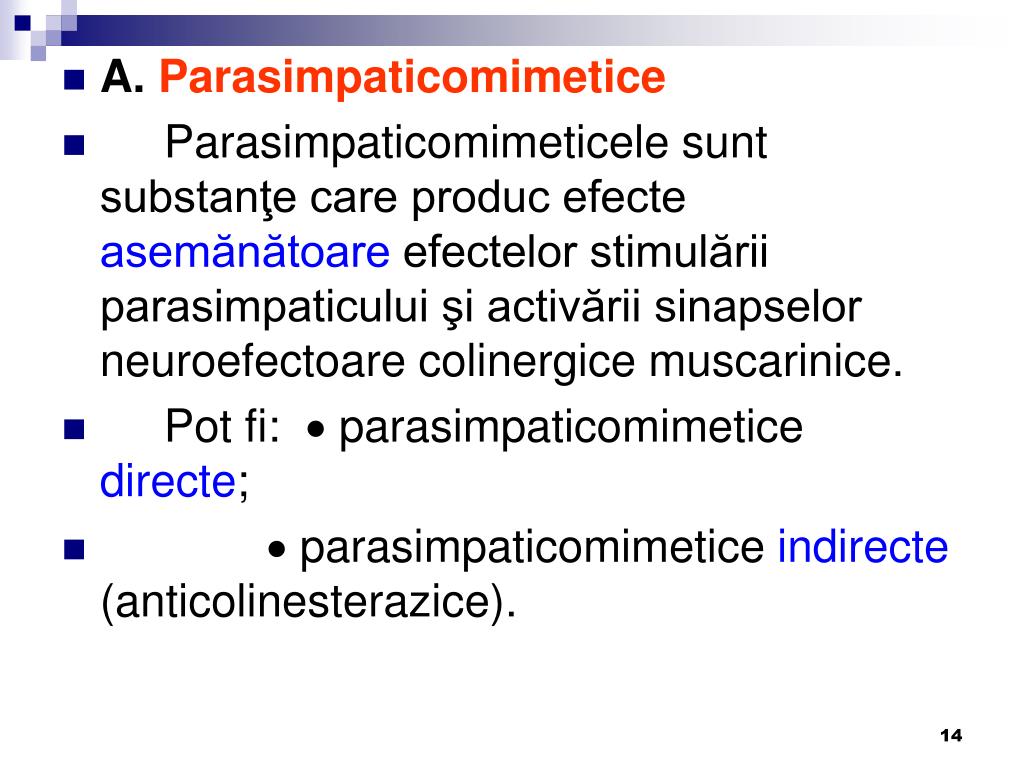 A. Parasimpaticomimetice • Parasimpaticomimeticele sunt substanţe care produc efecte asemănătoare efectelor stimulării parasimpaticului şi activării sinapselor neuroefectoare colinergice muscarinice. • Pot fi: parasimpaticomimetice directe; • parasimpaticomimetice indirecte (anticolinesterazice).