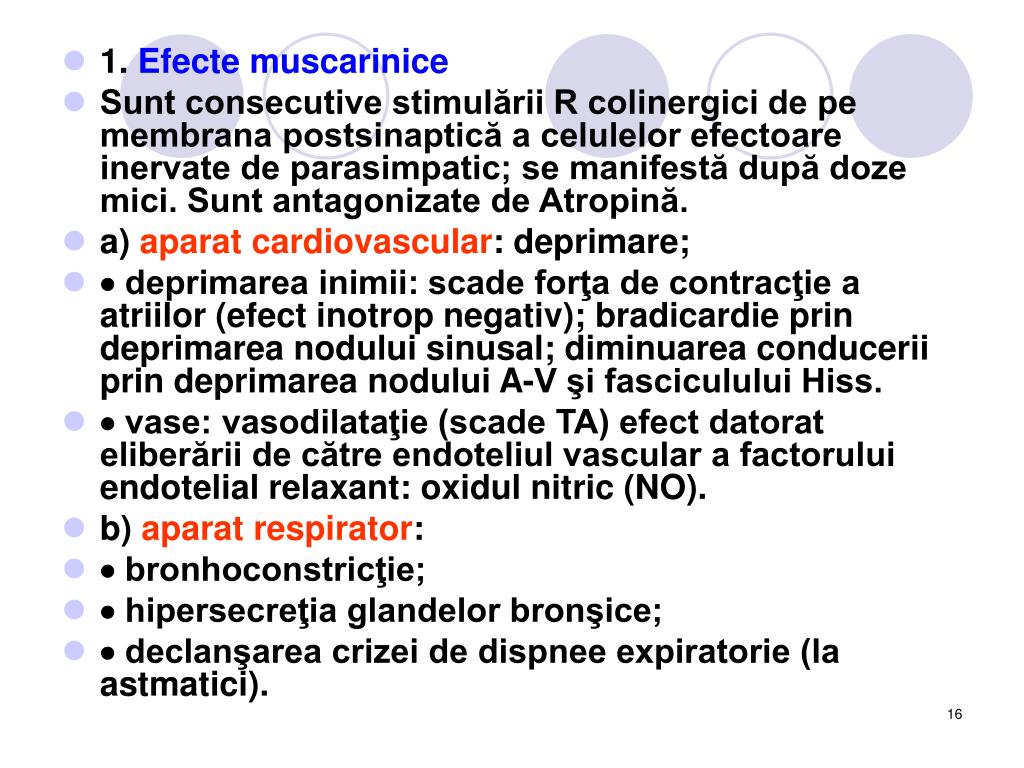 1. Efecte muscarinice • Sunt consecutive stimulării R colinergici de pe membrana postsinaptică a celulelor efectoare inervate de parasimpatic; se manifestă după doze mici. Sunt antagonizate de Atropină. • a) aparat cardiovascular: deprimare; • deprimarea inimii: scade forţa de contracţie a atriilor (efect inotrop negativ); bradicardie prin deprimarea nodului sinusal; diminuarea conducerii prin deprimarea nodului A-V şi fasciculului Hiss. • vase: vasodilataţie (scade TA) efect datorat eliberării de către endoteliul vascular a factorului endotelial relaxant: oxidul nitric (NO). • b) aparat respirator: • bronhoconstricţie; • hipersecreţia glandelor bronşice; • declanşarea crizei de dispnee expiratorie (la astmatici).