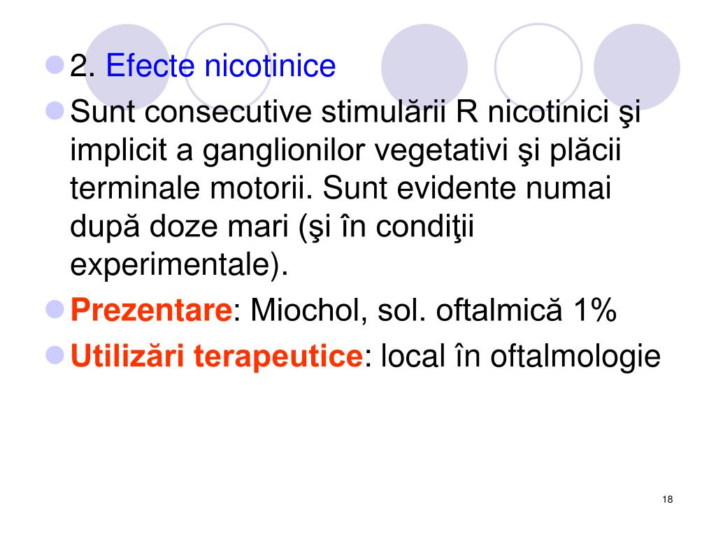 2. Efecte nicotinice • Sunt consecutive stimulării R nicotinici şi implicit a ganglionilor vegetativi şi plăcii terminale motorii. Sunt evidente numai după doze mari (şi în condiţii experimentale). • Prezentare: Miochol, sol. oftalmică 1% • Utilizări terapeutice: local în oftalmologie