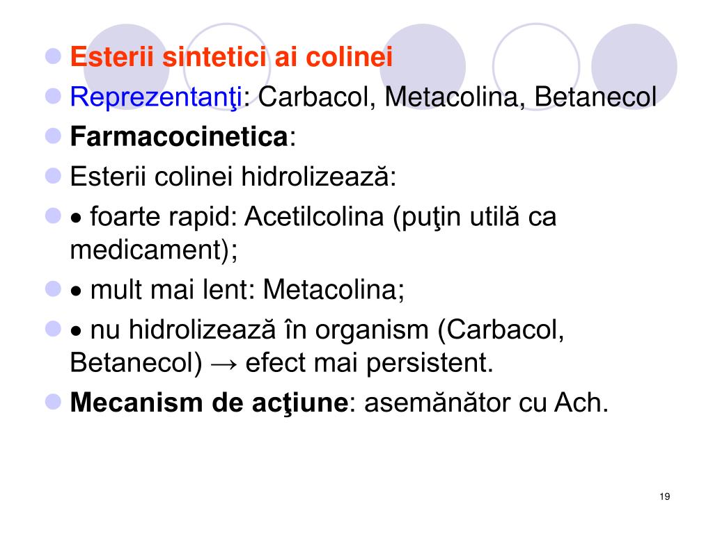 Esterii sintetici ai colinei • Reprezentanţi: Carbacol, Metacolina, Betanecol • Farmacocinetica: • Esterii colinei hidrolizează: • foarte rapid: Acetilcolina (puţin utilă ca medicament); • mult mai lent: Metacolina; • nu hidrolizează în organism (Carbacol, Betanecol) → efect mai persistent. • Mecanism de acţiune: asemănător cu Ach.
