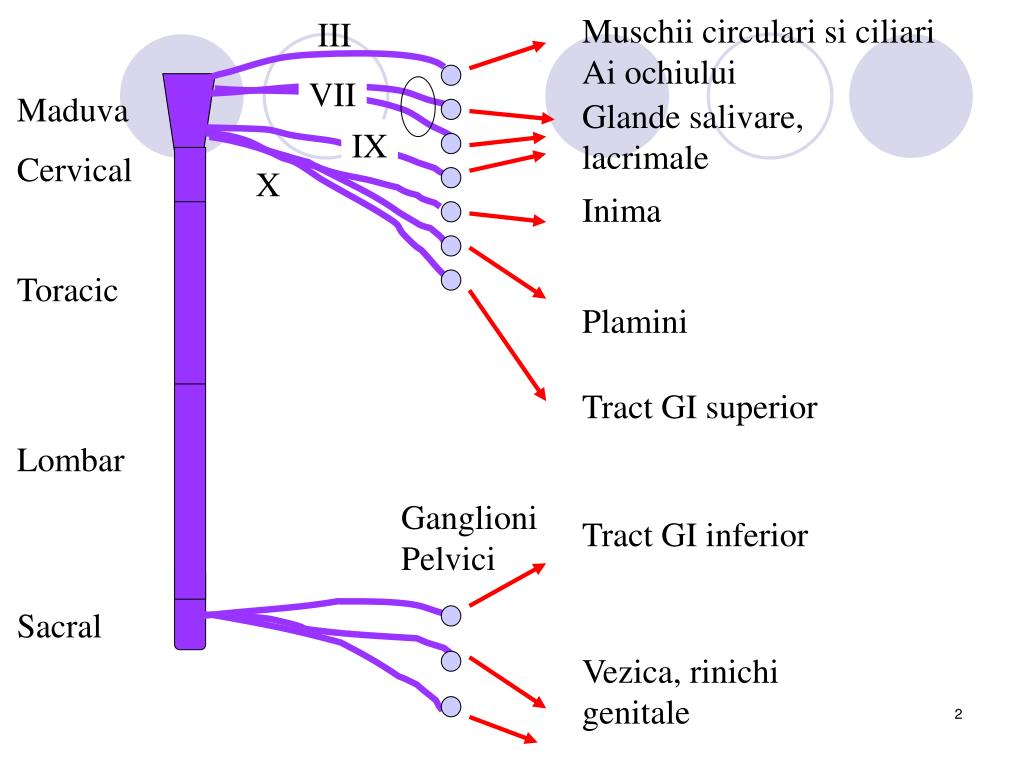Muschii circulari si ciliari Ai ochiului III VII Maduva Glande salivare, lacrimale IX Cervical X Inima Toracic Plamini Tract GI superior Lombar Ganglioni Pelvici Tract GI inferior Sacral Vezica, rinichi genitale
