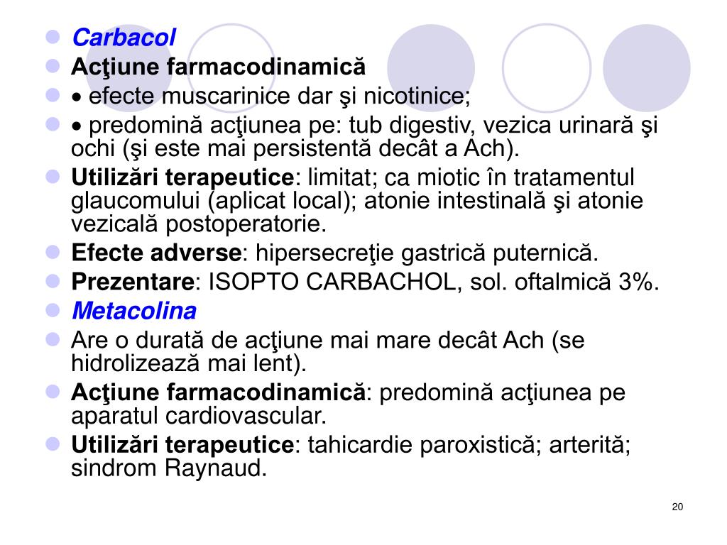 Carbacol • Acţiune farmacodinamică • efecte muscarinice dar şi nicotinice; • predomină acţiunea pe: tub digestiv, vezica urinară şi ochi (şi este mai persistentă decât a Ach). • Utilizări terapeutice: limitat; ca miotic în tratamentul glaucomului (aplicat local); atonie intestinală şi atonie vezicală postoperatorie. • Efecte adverse: hipersecreţie gastrică puternică. • Prezentare: ISOPTO CARBACHOL, sol. oftalmică 3%. • Metacolina • Are o durată de acţiune mai mare decât Ach (se hidrolizează mai lent). • Acţiune farmacodinamică: predomină acţiunea pe aparatul cardiovascular. • Utilizări terapeutice: tahicardie paroxistică; arterită; sindrom Raynaud.