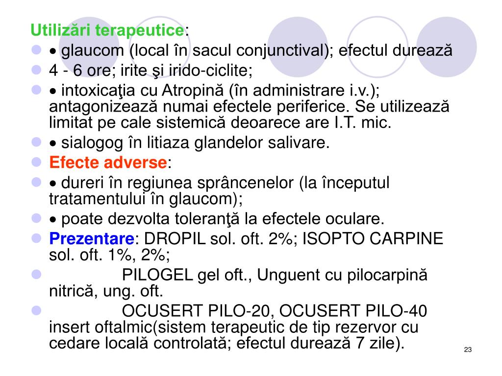 Utilizări terapeutice: • glaucom (local în sacul conjunctival); efectul durează • 4 - 6 ore; irite şi irido-ciclite; • intoxicaţia cu Atropină (în administrare i.v.); antagonizează numai efectele periferice. Se utilizează limitat pe cale sistemică deoarece are I.T. mic. • sialogog în litiaza glandelor salivare. • Efecte adverse: • dureri în regiunea sprâncenelor (la începutul tratamentului în glaucom); • poate dezvolta toleranţă la efectele oculare. • Prezentare: DROPIL sol. oft. 2%; ISOPTO CARPINE sol. oft. 1%, 2%; • PILOGEL gel oft., Unguent cu pilocarpină nitrică, ung. oft. • OCUSERT PILO-20, OCUSERT PILO-40 insert oftalmic(sistem terapeutic de tip rezervor cu cedare locală controlată; efectul durează 7 zile).