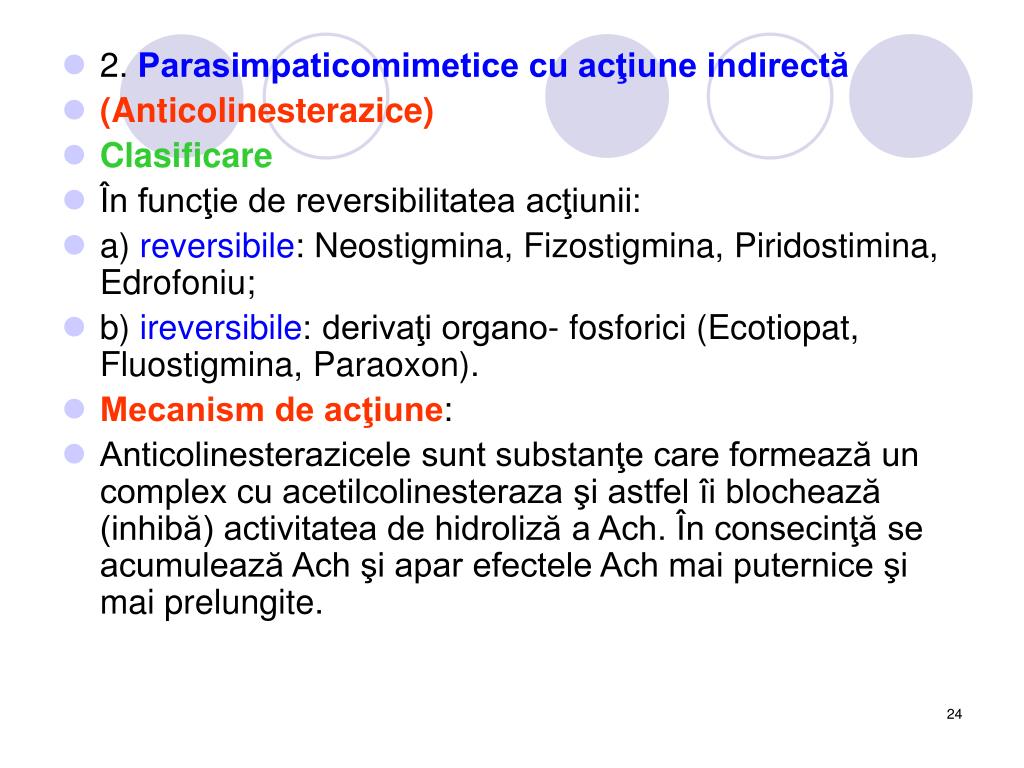 2. Parasimpaticomimetice cu acţiune indirectă • (Anticolinesterazice) • Clasificare • În funcţie de reversibilitatea acţiunii: • a) reversibile: Neostigmina, Fizostigmina, Piridostimina, Edrofoniu; • b) ireversibile: derivaţi organo- fosforici (Ecotiopat, Fluostigmina, Paraoxon). • Mecanism de acţiune: • Anticolinesterazicele sunt substanţe care formează un complex cu acetilcolinesteraza şi astfel îi blochează (inhibă) activitatea de hidroliză a Ach. În consecinţă se acumulează Ach şi apar efectele Ach mai puternice şi mai prelungite.