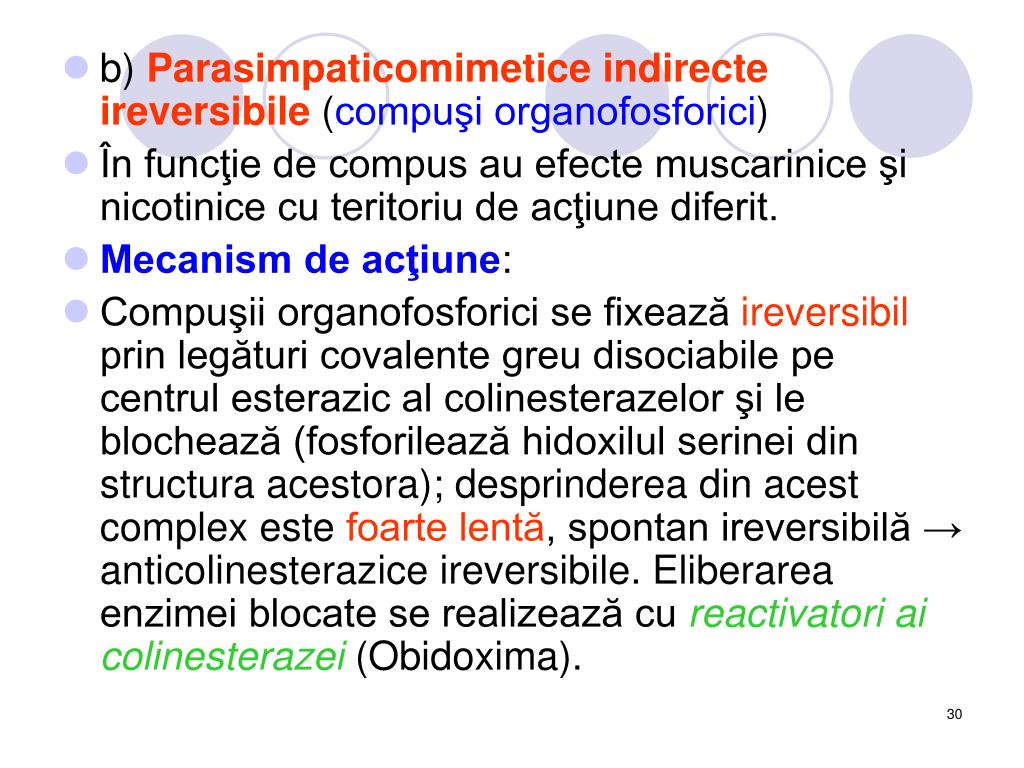 b) Parasimpaticomimetice indirecte ireversibile(compuşi organofosforici) • În funcţie de compus au efecte muscarinice şi nicotinice cu teritoriu de acţiune diferit. • Mecanism de acţiune: • Compuşii organofosforici se fixează ireversibil prin legături covalente greu disociabile pe centrul esterazic al colinesterazelor şi le blochează (fosforilează hidoxilul serinei din structura acestora); desprinderea din acest complex este foarte lentă, spontan ireversibilă → anticolinesterazice ireversibile. Eliberarea enzimei blocate se realizează cu reactivatori ai colinesterazei (Obidoxima).