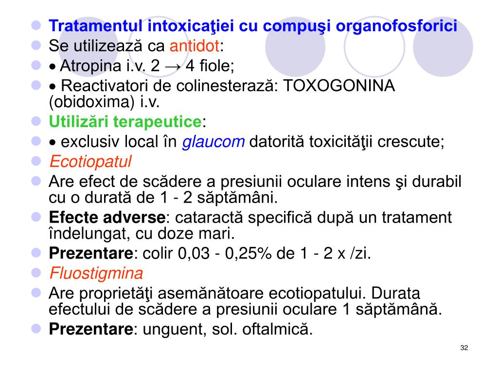Tratamentul intoxicaţiei cu compuşi organofosforici • Se utilizează ca antidot: • Atropina i.v. 2 → 4 fiole; • Reactivatori de colinesterază: TOXOGONINA (obidoxima) i.v. • Utilizări terapeutice: • exclusiv local în glaucom datorită toxicităţii crescute; • Ecotiopatul • Are efect de scădere a presiunii oculare intens şi durabil cu o durată de 1 - 2 săptămâni. • Efecte adverse: cataractă specifică după un tratament îndelungat, cu doze mari. • Prezentare: colir 0,03 - 0,25% de 1 - 2 x /zi. • Fluostigmina • Are proprietăţi asemănătoare ecotiopatului. Durata efectului de scădere a presiunii oculare 1 săptămână. • Prezentare: unguent, sol. oftalmică.