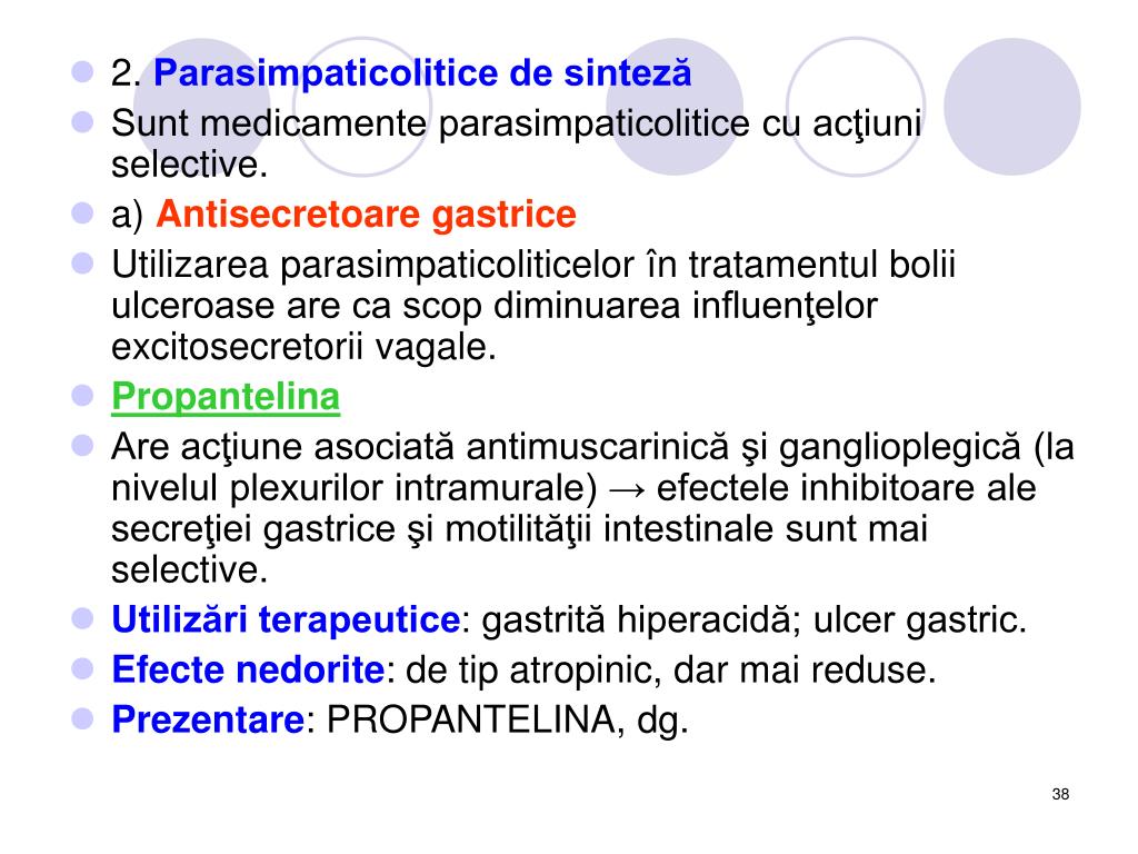 2. Parasimpaticolitice de sinteză • Sunt medicamente parasimpaticolitice cu acţiuni selective. • a) Antisecretoare gastrice • Utilizarea parasimpaticoliticelor în tratamentul bolii ulceroase are ca scop diminuarea influenţelor excitosecretorii vagale. • Propantelina • Are acţiune asociată antimuscarinică şi ganglioplegică (la nivelul plexurilor intramurale) → efectele inhibitoare ale secreţiei gastrice şi motilităţii intestinale sunt mai selective. • Utilizări terapeutice: gastrită hiperacidă; ulcer gastric. • Efecte nedorite: de tip atropinic, dar mai reduse. • Prezentare: PROPANTELINA, dg.