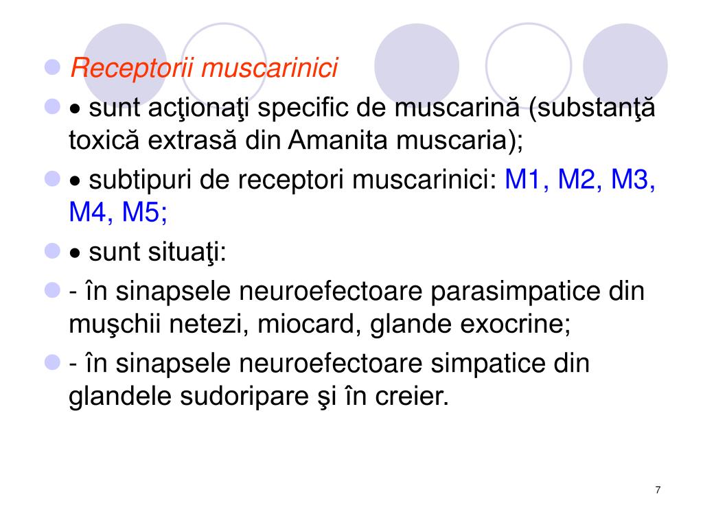 Receptorii muscarinici • sunt acţionaţi specific de muscarină (substanţă toxică extrasă din Amanita muscaria); • subtipuri de receptori muscarinici: M1, M2, M3, M4, M5; • sunt situaţi: • - în sinapsele neuroefectoare parasimpatice din muşchii netezi, miocard, glande exocrine; • - în sinapsele neuroefectoare simpatice din glandele sudoripare şi în creier.