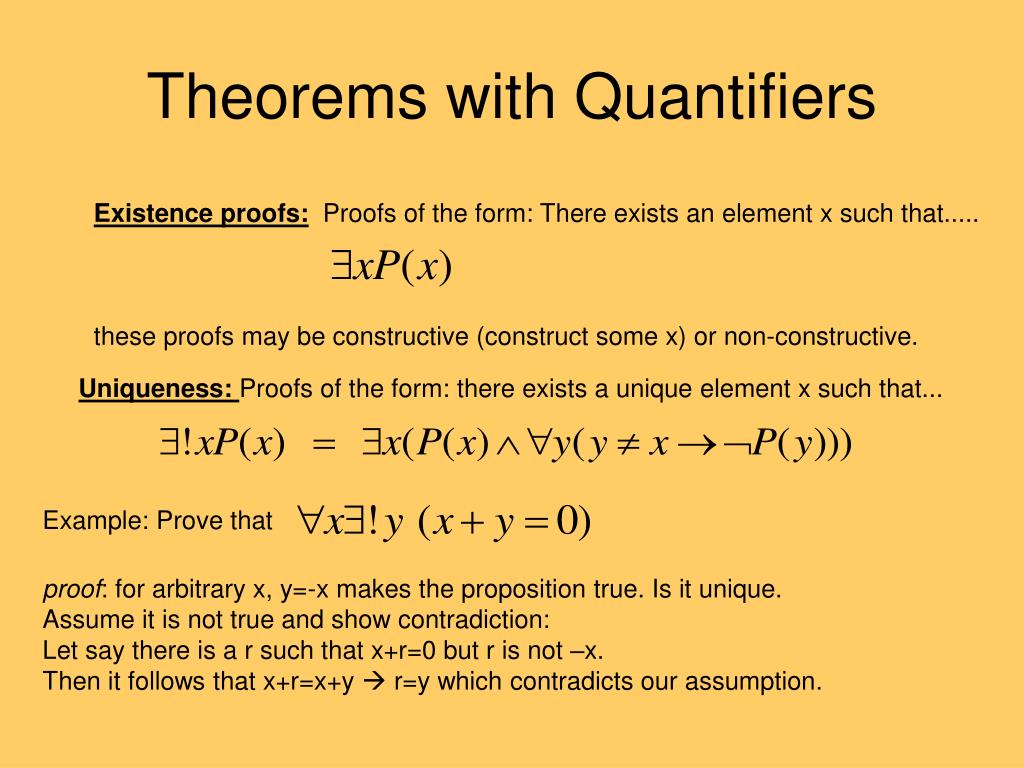 Theorems with Quantifiers Existence proofs: Proofs of the form: There exists an element x such that..... these proofs may be constructive (construct some x) or non-constructive. Uniqueness: Proofs of the form: there exists a unique element x such that... Example: Prove that proof: for arbitrary x, y=-x makes the proposition true. Is it unique. Assume it is not true and show contradiction: Let say there is a r such that x+r=0 but r is not –x. Then it follows that x+r=x+y r=y which contradicts our assumption.