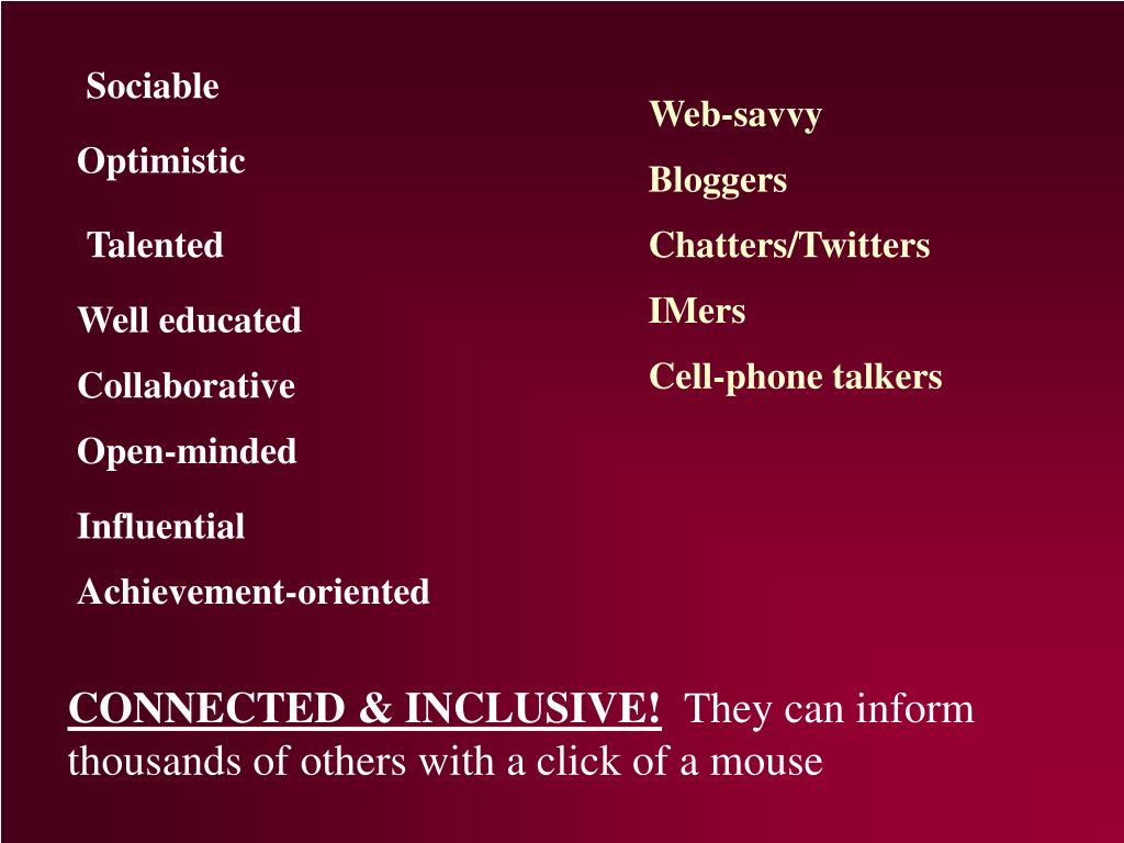 Sociable Web-savvy Optimistic Bloggers Talented Chatters/Twitters IMers Well educated Cell-phone talkers Collaborative Open-minded Influential Achievement-oriented CONNECTED & INCLUSIVE! They can inform thousands of others with a click of a mouse