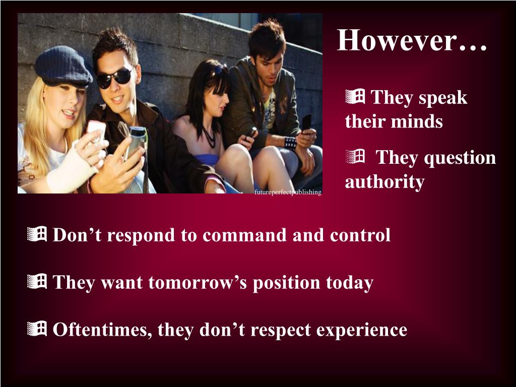 However… They speak their minds • They question authority futureperfectpublishing Don’t respond to command and control They want tomorrow’s position today Oftentimes, they don’t respect experience