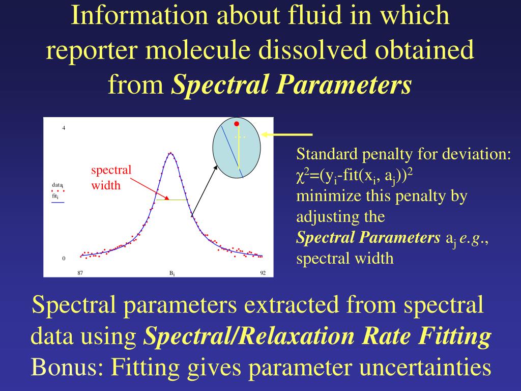 Information about fluid in which reporter molecule dissolved obtained from Spectral Parameters … Standard penalty for deviation: χ2=(yi-fit(xi, aj))2 minimize this penalty by adjusting the Spectral Parameters aj e.g., spectral width spectral width Spectral parameters extracted from spectral data using Spectral/Relaxation Rate Fitting Bonus: Fitting gives parameter uncertainties