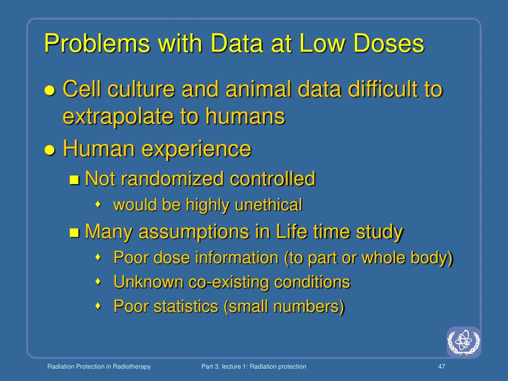 Problems with Data at Low Doses • Cell culture and animal data difficult to extrapolate to humans • Human experience • Not randomized controlled • would be highly unethical • Many assumptions in Life time study • Poor dose information (to part or whole body) • Unknown co-existing conditions • Poor statistics (small numbers) Part 3, lecture 1: Radiation protection