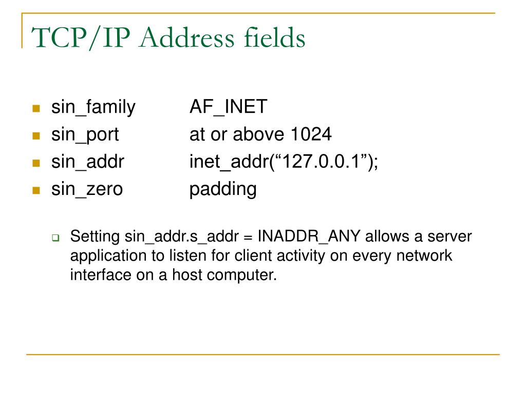 TCP/IP Address fields • sin_family AF_INET • sin_port at or above 1024 • sin_addr inet_addr(“127.0.0.1”); • sin_zero padding • Setting sin_addr.s_addr = INADDR_ANY allows a server application to listen for client activity on every network interface on a host computer.