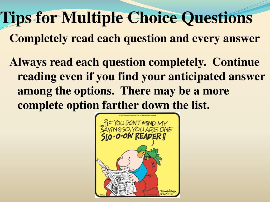 Tips for Multiple Choice Questions Completely read each question and every answer Always read each question completely. Continue reading even if you find your anticipated answer among the options. There may be a more complete option farther down the list.