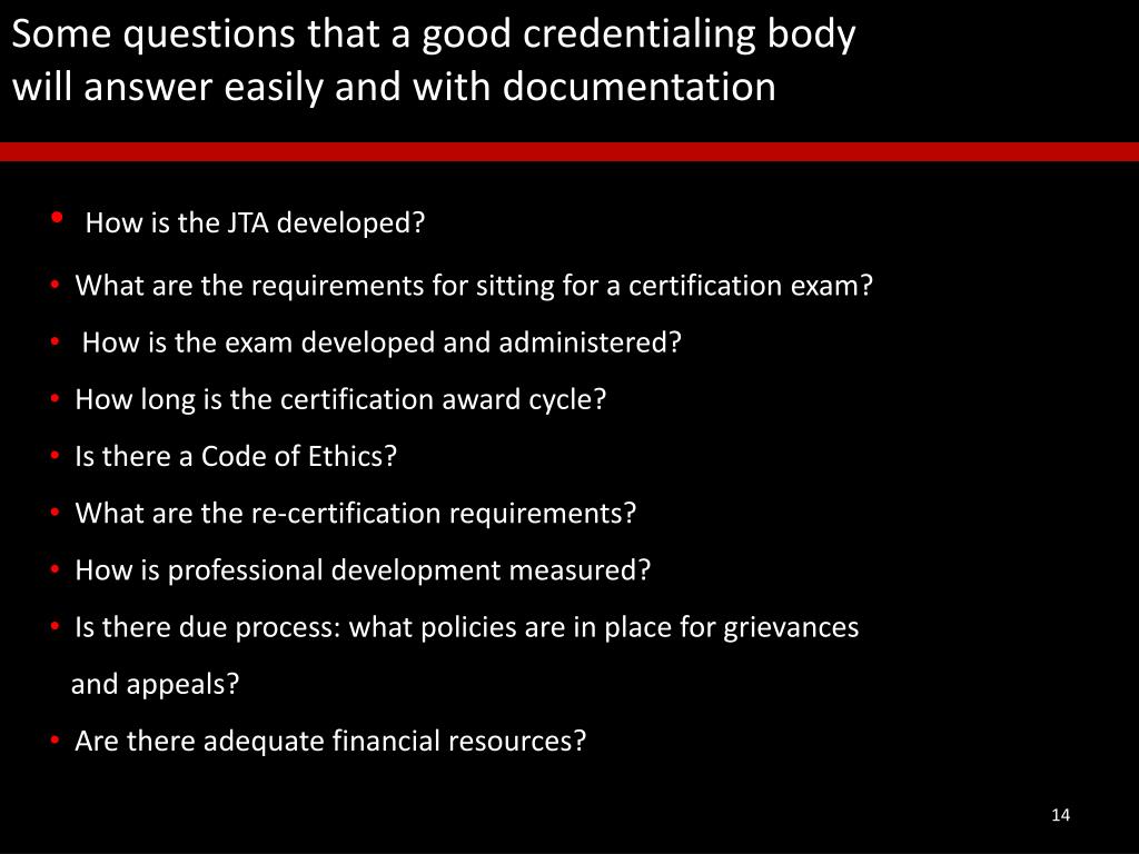 Some questions that a good credentialing body will answer easily and with documentation • How is the JTA developed? • What are the requirements for sitting for a certification exam? • How is the exam developed and administered? • How long is the certification award cycle? • Is there a Code of Ethics? • What are the re-certification requirements? • How is professional development measured? • Is there due process: what policies are in place for grievances • and appeals? • Are there adequate financial resources?