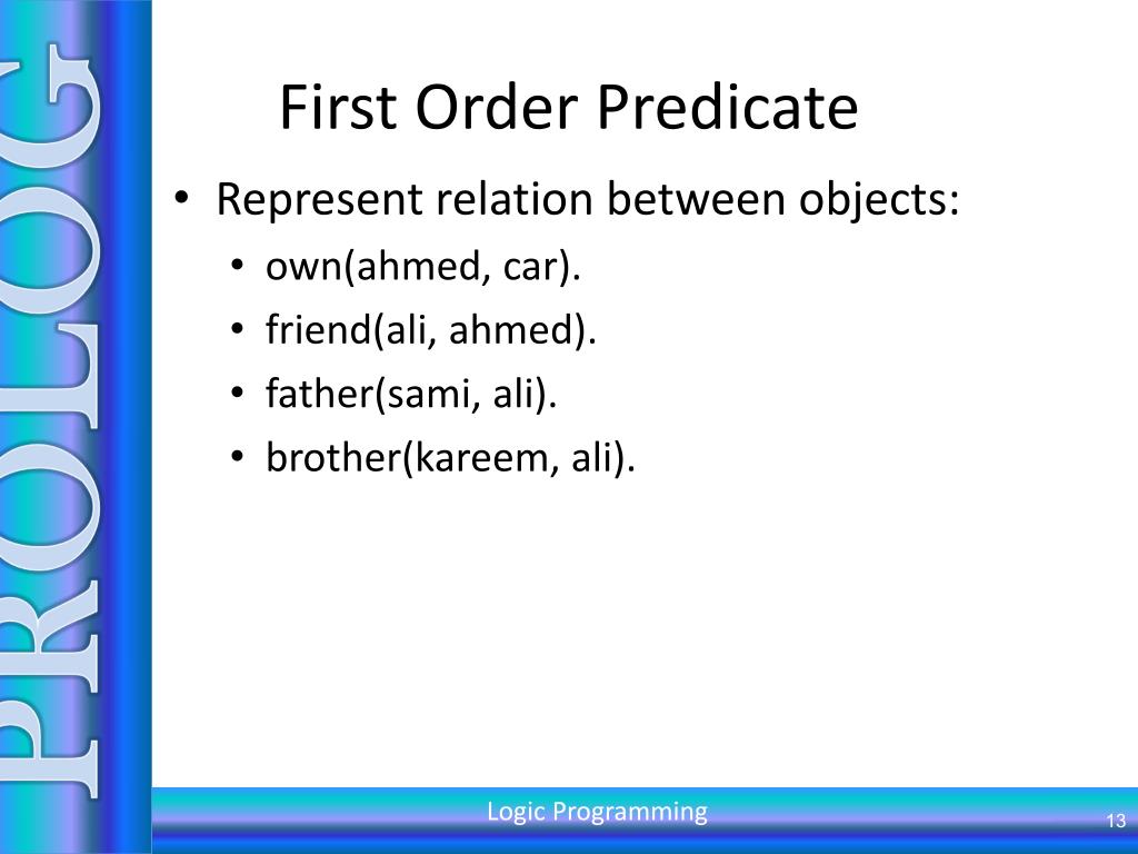 First Order Predicate • Represent relation between objects: • own(ahmed, car). • friend(ali, ahmed). • father(sami, ali). • brother(kareem, ali). PROLOG Logic Programming