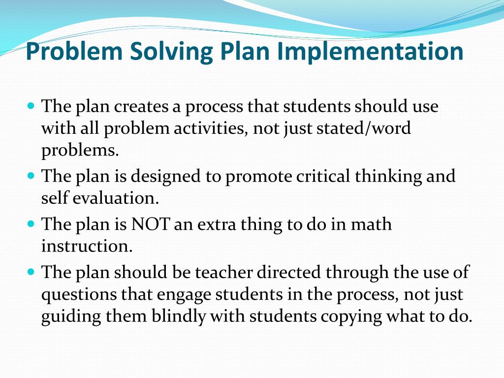 Problem Solving Plan Implementation • The plan creates a process that students should use with all problem activities, not just stated/word problems. • The plan is designed to promote critical thinking and self evaluation. • The plan is NOT an extra thing to do in math instruction. • The plan should be teacher directed through the use of questions that engage students in the process, not just guiding them blindly with students copying what to do.