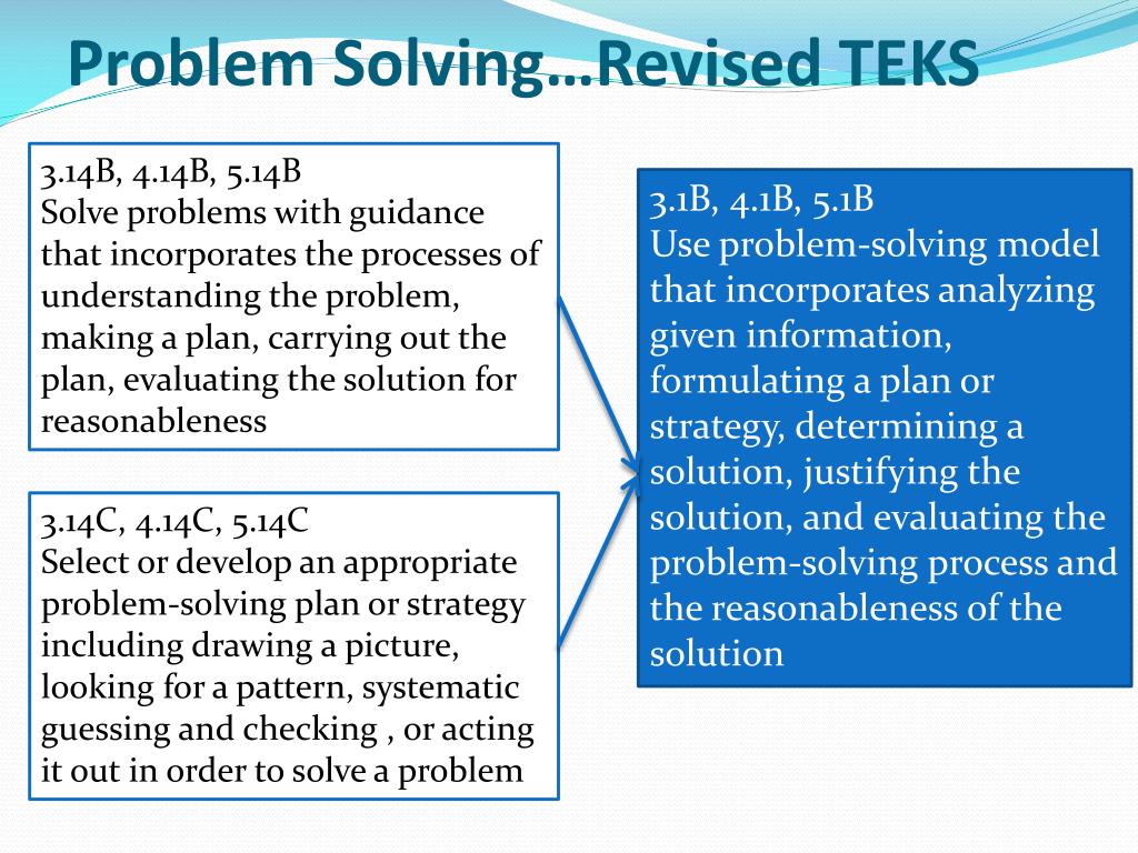 Problem Solving…Revised TEKS 3.14B, 4.14B, 5.14B Solve problems with guidance that incorporates the processes of understanding the problem, making a plan, carrying out the plan, evaluating the solution for reasonableness 3.1B, 4.1B, 5.1B Use problem-solving model that incorporates analyzing given information, formulating a plan or strategy, determining a solution, justifying the solution, and evaluating the problem-solving process and the reasonableness of the solution 3.14C, 4.14C, 5.14C Select or develop an appropriate problem-solving plan or strategy including drawing a picture, looking for a pattern, systematic guessing and checking , or acting it out in order to solve a problem
