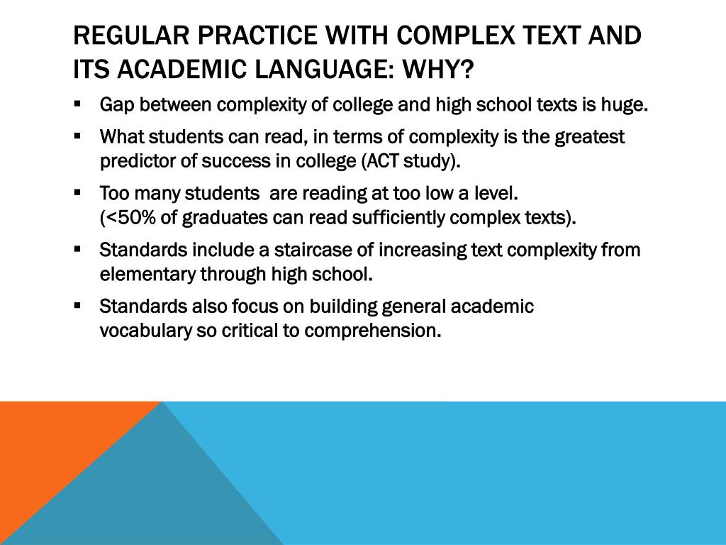 Regular Practice With Complex text and Its Academic Language: Why? • Gap between complexity of college and high school texts is huge. • What students can read, in terms of complexity is the greatest predictor of success in college (ACT study). • Too many students are reading at too low a level.(<50% of graduates can read sufficiently complex texts). • Standards include a staircase of increasing text complexity from elementary through high school. • Standards also focus on building general academic vocabulary so critical to comprehension.
