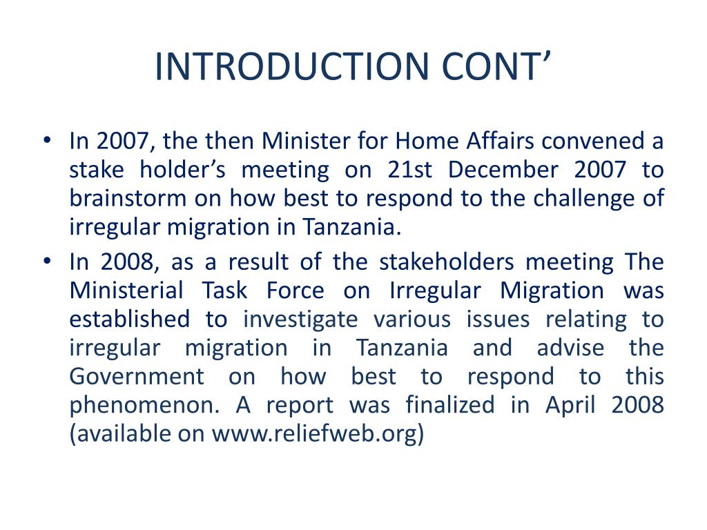 INTRODUCTION CONT’ • In 2007, the then Minister for Home Affairs convened a stake holder’s meeting on 21st December 2007 to brainstorm on how best to respond to the challenge of irregular migration in Tanzania. • In 2008, as a result of the stakeholders meeting The Ministerial Task Force on Irregular Migration was established to investigate various issues relating to irregular migration in Tanzania and advise the Government on how best to respond to this phenomenon. A report was finalized in April 2008 (available on www.reliefweb.org)