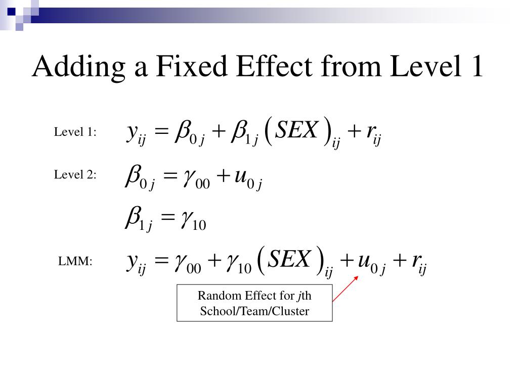 Adding a Fixed Effect from Level 1 Level 1: Level 2: LMM: Fixed Effect (Intercept) Fixed Effect (Slope)