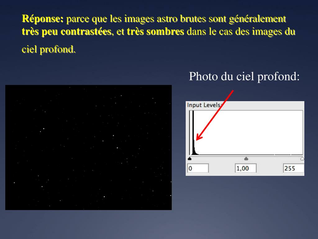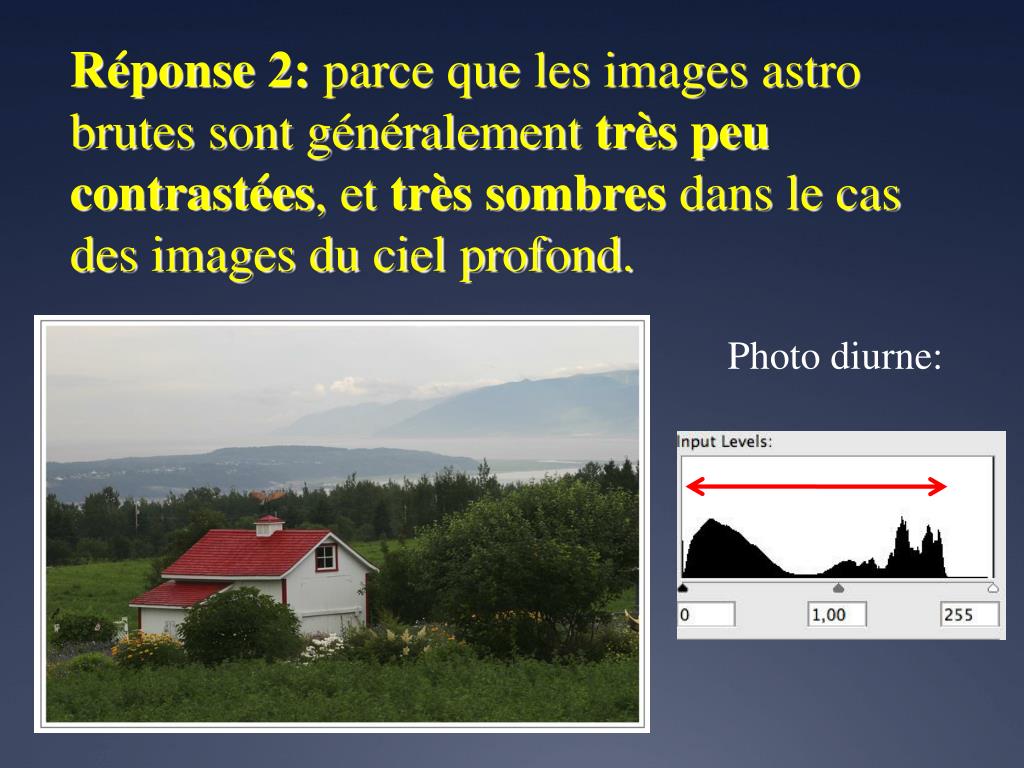 Réponse 2: parce que les images astro brutes sont généralement très peu contrastées, et très sombres dans le cas des images du ciel profond. Photo diurne: