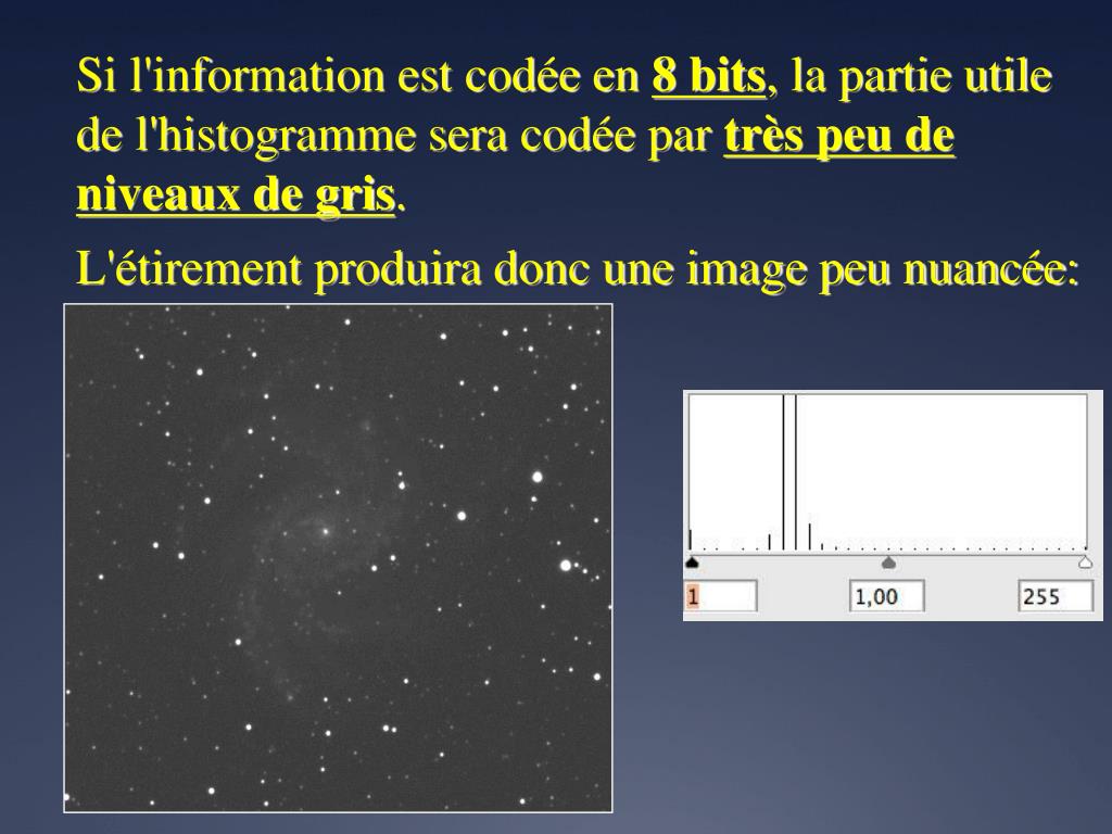 Si l'information est codée en 8 bits, la partie utile de l'histogramme sera codée par très peu de niveaux de gris. L'étirement produira donc une image peu nuancée: