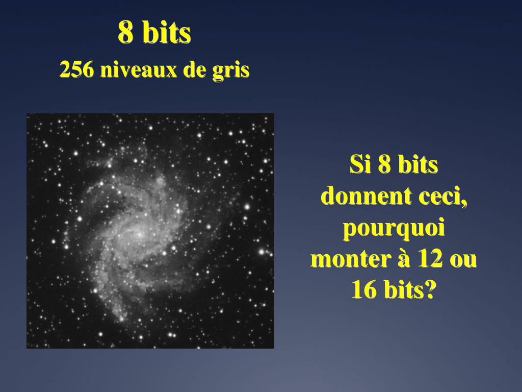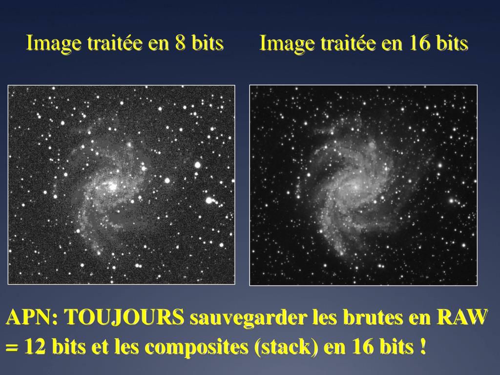 Image traitée en 8 bits Image traitée en 16 bits APN: TOUJOURS sauvegarder les brutes en RAW = 12 bits et les composites (stack) en 16 bits !