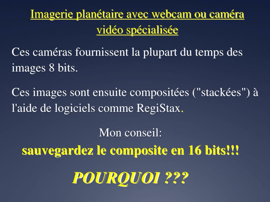Imagerie planétaire avec webcam ou caméra vidéo spécialisée Ces caméras fournissent la plupart du temps des images 8 bits. Ces images sont ensuite compositées ("stackées") à l'aide de logiciels comme RegiStax. Mon conseil: sauvegardez le composite en 16 bits!!! POURQUOI ???