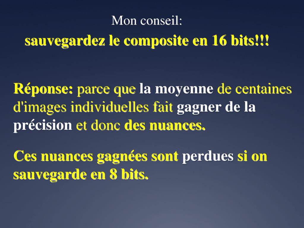 Mon conseil: sauvegardez le composite en 16 bits!!! Réponse: parce que la moyennede centaines d'images individuelles faitgagner de la précision et donc des nuances. Ces nuances gagnées sont perdues si on sauvegarde en 8 bits.