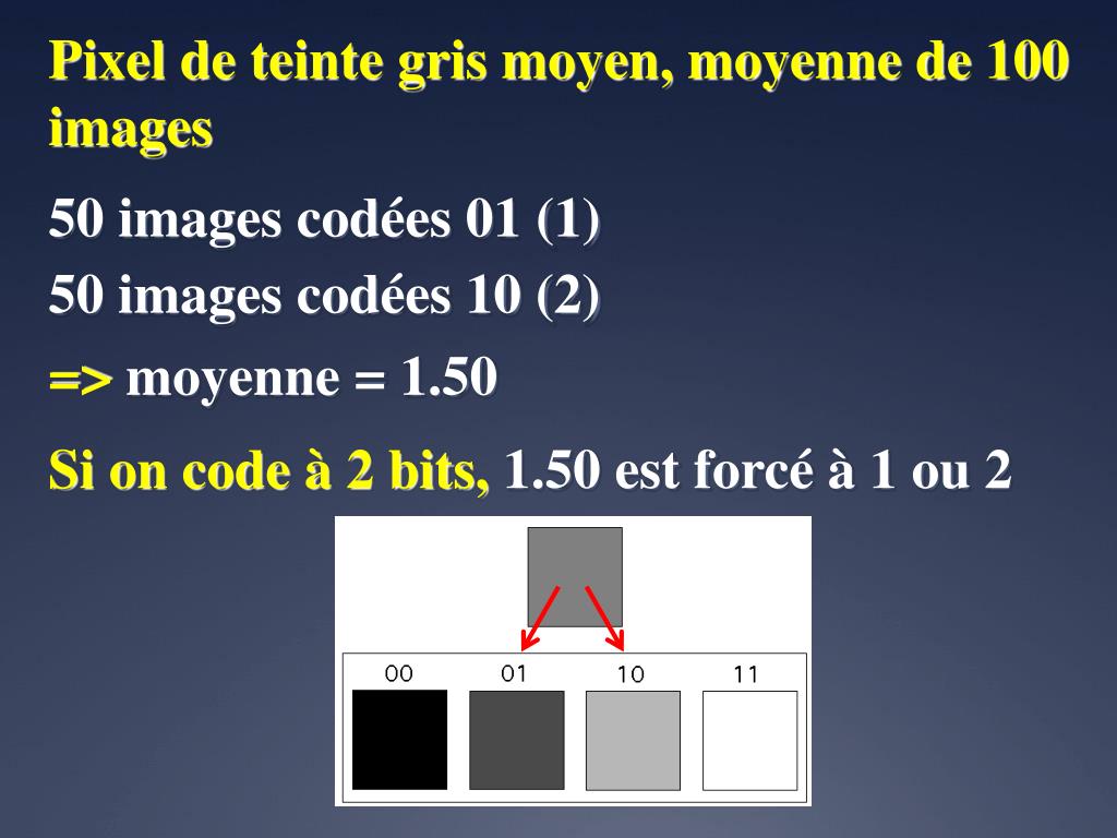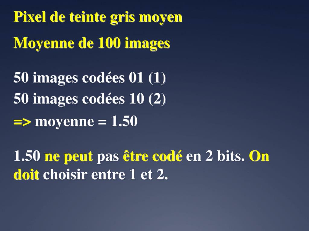 Pixel de teinte gris moyen Moyenne de 100 images 50 images codées 01 (1) 50 images codées 10 (2) => moyenne = 1.50 1.50 ne peut pas être codé en 2 bits. On doit choisir entre 1 et 2.