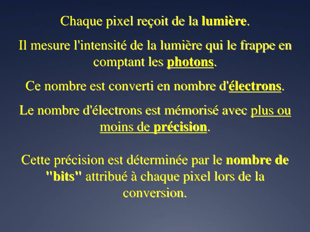 Chaque pixel reçoit de la lumière. Il mesure l'intensité de la lumière qui le frappe en comptant les photons. Ce nombre est converti en nombre d'électrons. Le nombre d'électrons est mémorisé avec plus ou moins de précision. Cette précision est déterminée par le nombre de "bits" attribué à chaque pixel lors de la conversion.