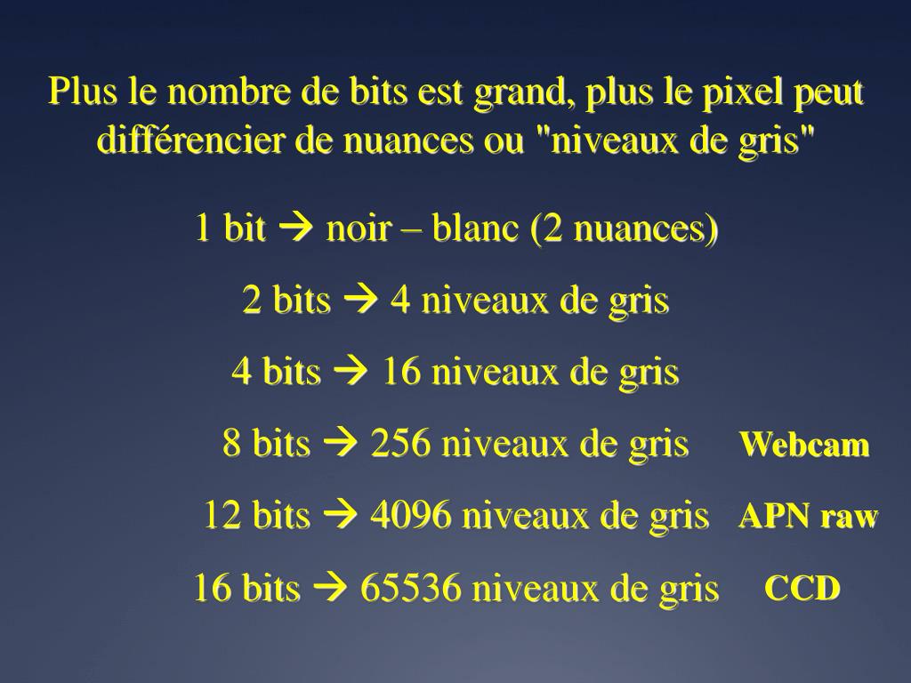 Plus le nombre de bits est grand, plus le pixel peut différencier de nuances ou "niveaux de gris" 1 bit noir – blanc (2 nuances) 2 bits 4 niveaux de gris 4 bits 16 niveaux de gris 8 bits 256 niveaux de gris Webcam 12 bits 4096 niveaux de gris APN raw 16 bits 65536 niveaux de gris CCD