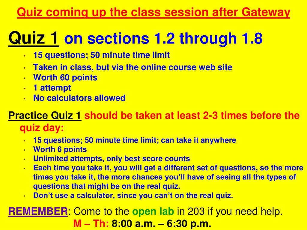 Quiz coming up the class session after Gateway Quiz 1on sections 1.2 through 1.8 • 15 questions; 50 minute time limit • Taken in class, but via the online course web site • Worth 60 points • 1 attempt • No calculators allowed Practice Quiz 1should be taken at least 2-3 times before the quiz day: • 15 questions; 50 minute time limit; can take it anywhere • Worth 6 points • Unlimited attempts, only best score counts • Each time you take it, you will get a different set of questions, so the more times you take it, the more chances you’ll have of seeing all the types of questions that might be on the real quiz. • Don’t use a calculator, since you can’t on the real quiz. REMEMBER: Come to the open lab in 203 if you need help. M – Th: 8:00 a.m. – 6:30 p.m.